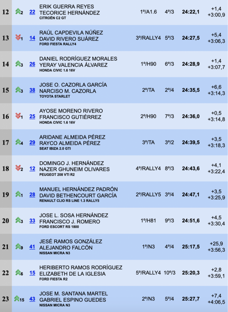 Gran rally el que están realizando también los equipos compuestos por Yeray Pérez-Carlos Ramírez (Renault Clio Williams) y Erick Guerra-Teco Hernández (Citroën C2 R2), undécimos y décimo segundos, logrando superar a Raúl Capdevila-David Rivero (Ford Fiesta Rally4), décimo terceros.