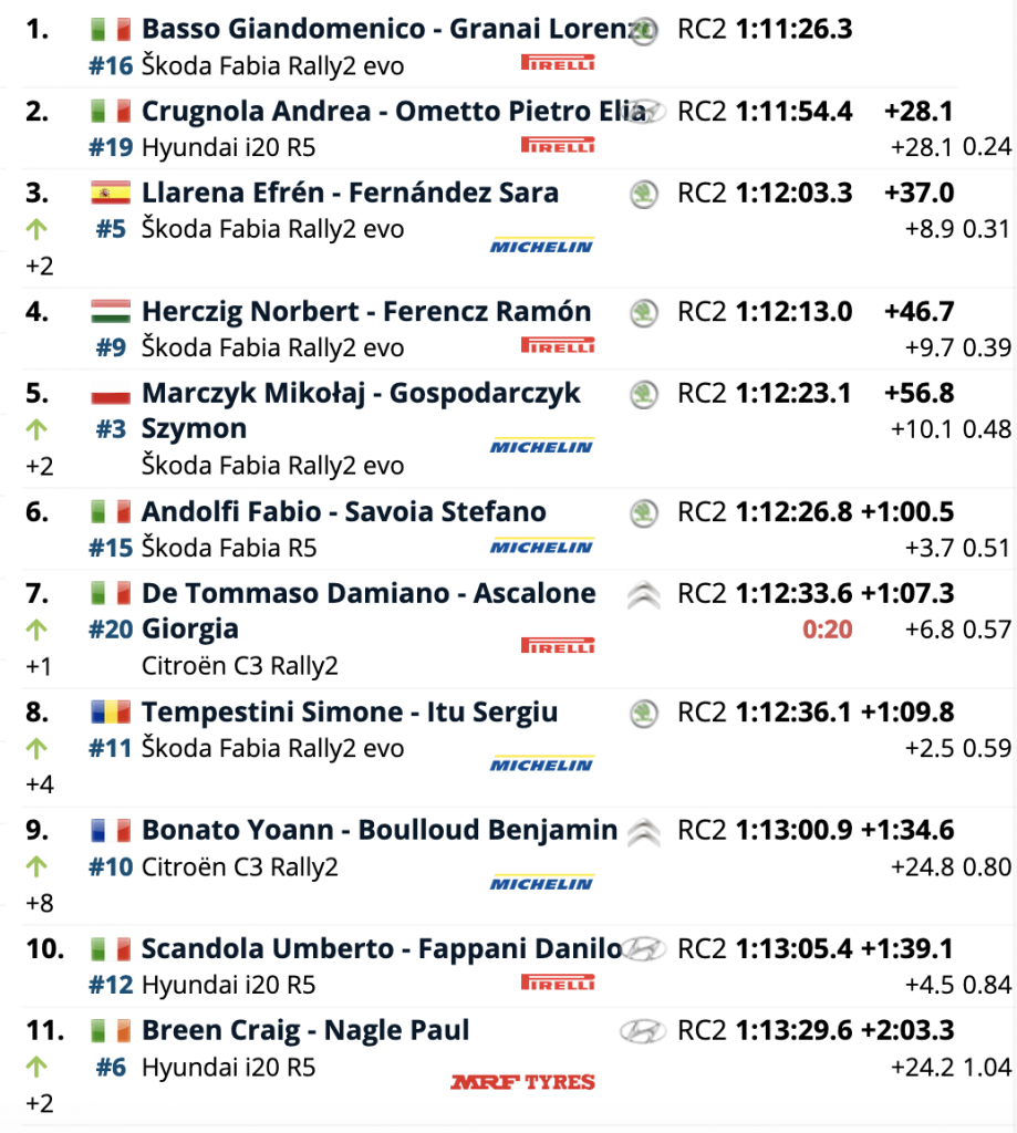 Los rusos Alexey Lukyanuk – Alexey Arnautov (Citroën C3 Rally2), que estaban en la tercera posición, con los dos primeros realmente lejos, se han encontrado, casi sin esperarlo, la posibilidad de pelear por la segunda plaza, puesto que en el segundo tramo se quedaban a 0.7 de mejorar un puesto en la general.