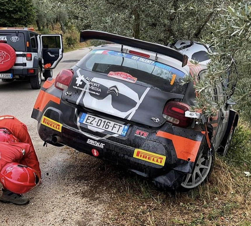 Lukyanuk: «Desafortunadamente, el rally italiano ha terminado para nosotros. En el tramo de Santopadre – Arpino resbalamos en la arena, nos salimos un poco de la pista y chocamos con un árbol con la rueda trasera. Rompimos la palanca y nos quedamos atascados. Había césped debajo del automóvil que se incendió unos minutos después; usamos un extintor de incendios. Es una suerte que hubiera una casa cerca de donde nos trajeron un poco de agua, lo inundaron todo. ¡Muy afortunado! Bueno, luego vinieron los bomberos, el tramo especial se detuvo para todos durante media hora por eso, aunque no hubo nada particularmente especial, en mi opinión».
