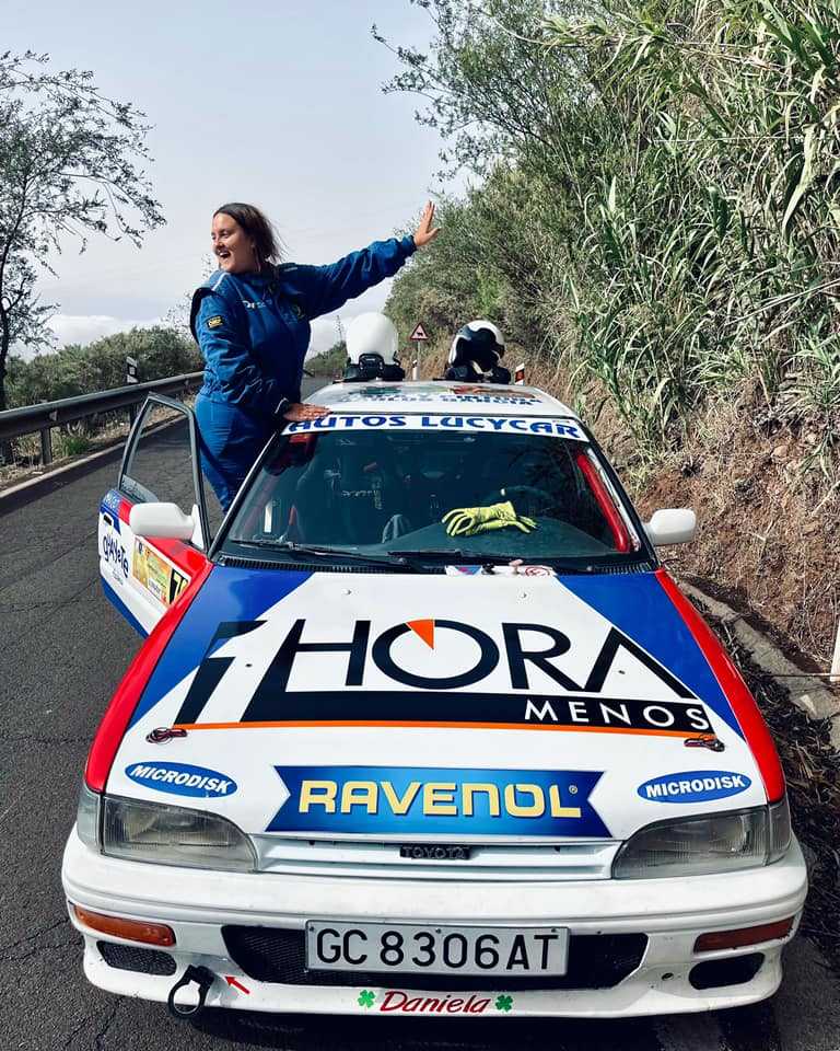 El pasado Rally Comarca Norte de Gran Canaria fue la última carrera, por lo menos en esta temporada 2021, para Daniela Acosta, que junto a su padre Alexis Acosta ha realizo varias carreras en el Toyota Corolla GTI. Y lo deja porque tras el verano afrontará el último curso de Terapeuta Ocupacional. Ojalá le salga todo bien y en un año la veamos de nuevo copilotando.