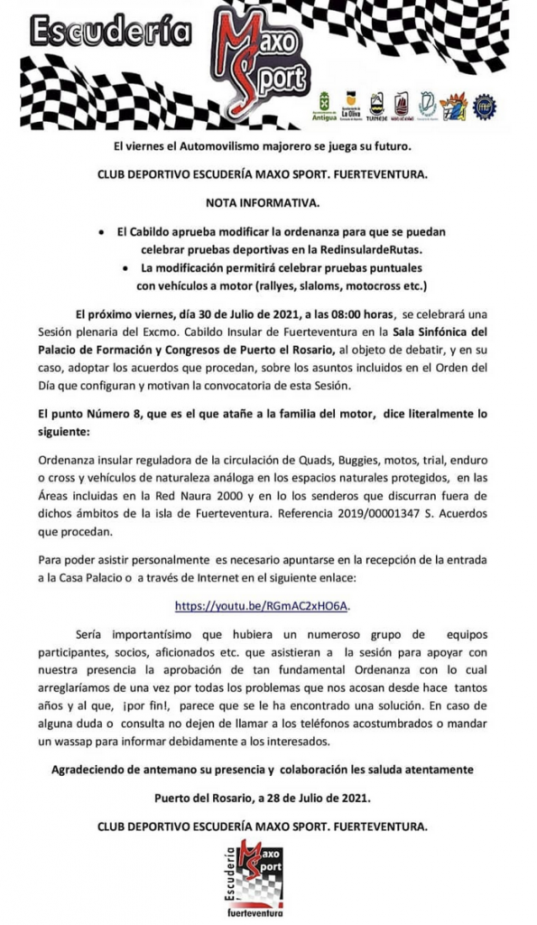 Según informa la escudería Maxo Sport, el Cabildo aprueba este viernes la ordenanza que permitirá la celebración de pruebas en Fuerteventura.
