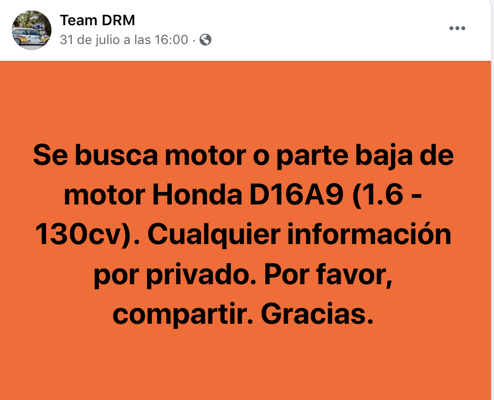 En un comunicado que han puesto en sus redes sociales se informa que «se busca motor o parte baja de motor de un Honda D16A9 (1.6 – 130cv)».