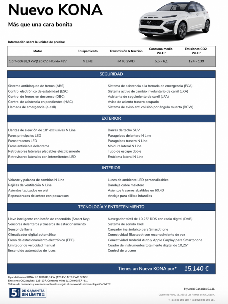 Hyundai Canarias nos cedió el nuevo Kona N Line, modelo que cuenta con un acabado dinámico inspirado en el deporte de motor, por lo que está repleto de potentes detalles. Con un pequeño vistazo se podrán apreciar toda la pasión que los diseñadores de la marca han puesto en este modelo para llevar al consumidor al lado más deportivo.