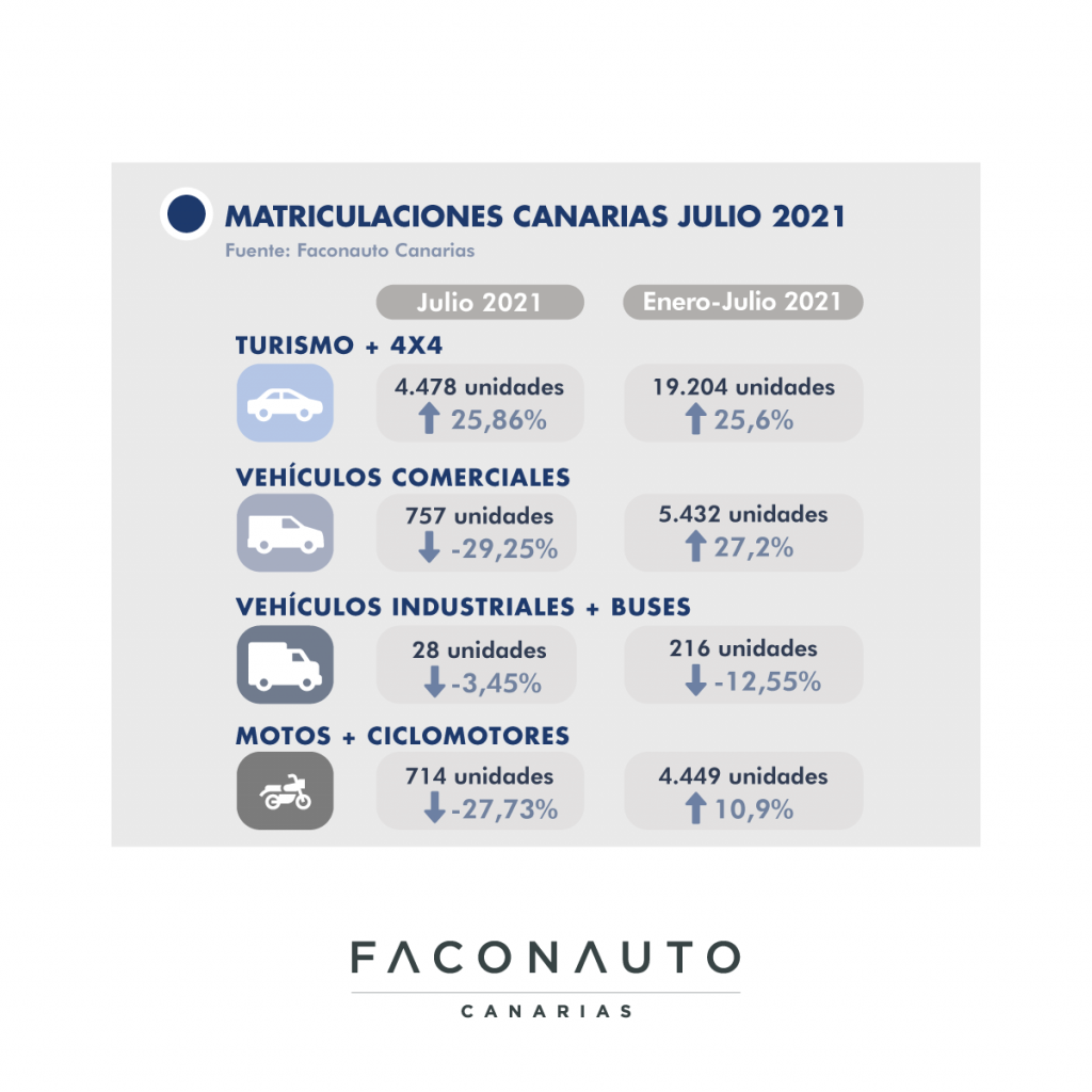 Guaguas y vehículos industriales registran una caída del 3,4% respecto a julio del año pasado, con sólo 28 unidades matriculadas. Y en el mercado de motos, las ventas han caído un 28% durante el pasado mes de julio, con 714 matriculaciones, frente a las 988 unidades matriculadas el año pasado.