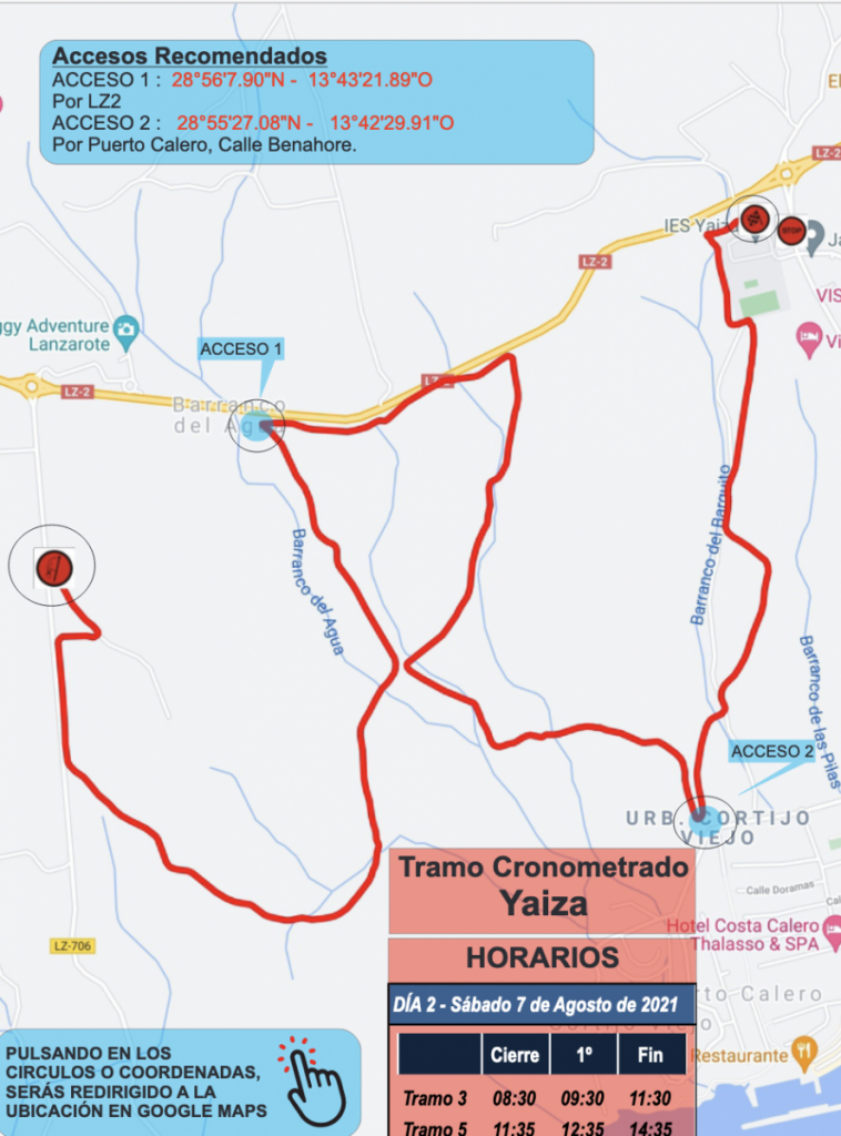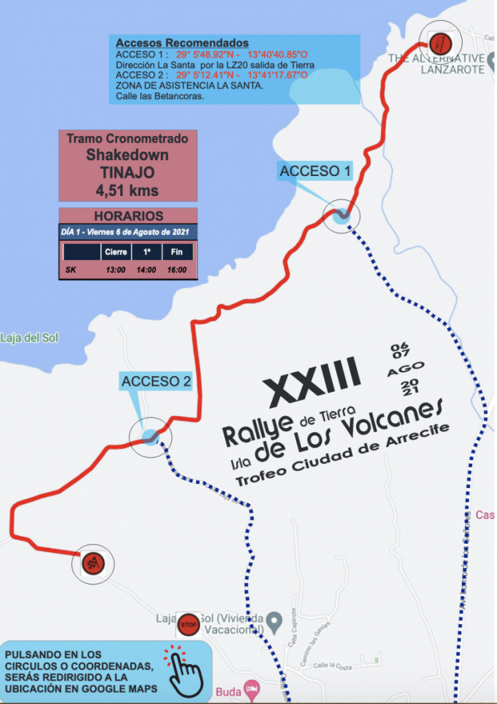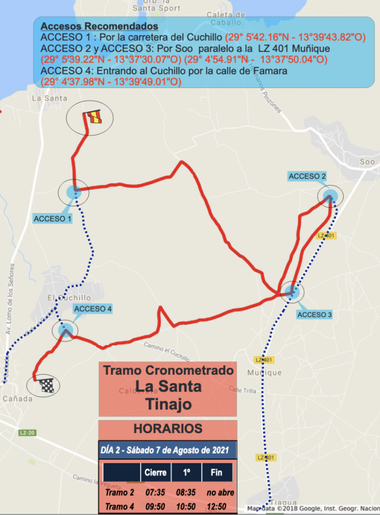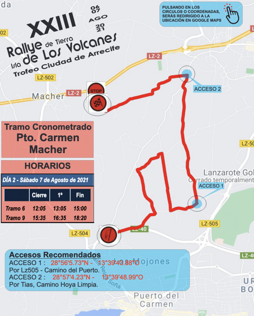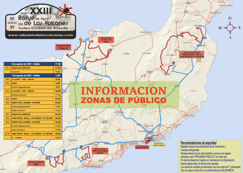 Cumpliendo con el programa previsto por la organización y el reglamento de la prueba, este jueves toca la publicación de los tramos cronometrados, su localización y distribución en el mapa insular de Lanzarote, con las cinco especiales diferentes seleccionadas para esta edición ya con su nombre y recorrido definido, tanto para los reconocimientos de los equipos participantes a partir del viernes, como de cara a los aficionados y público en general, que ahora ya disponen de una guía para planificar su asistencia al rallye.