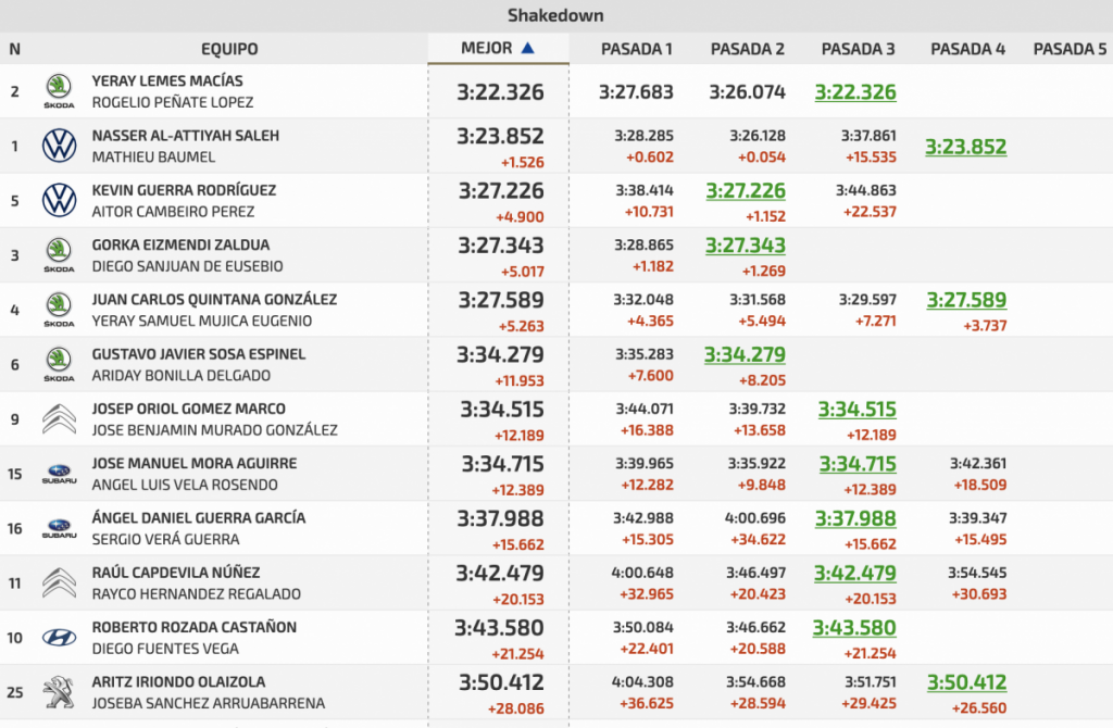 Yeray Lemes – Rogelio Peñate (Škoda Fabia R5) han sido los más rápidos del Shakedown del Rallye Isla de Los Volcanes, cita puntuable para la Copa de España de Rallyes de Tierra, al marcar un mejor crono de 3:22.326, seguidos de Nasser Saleh Al-Attiyah – Mathieu Baumel (Volkswagen Polo GTI R5) con un 3:23.852.