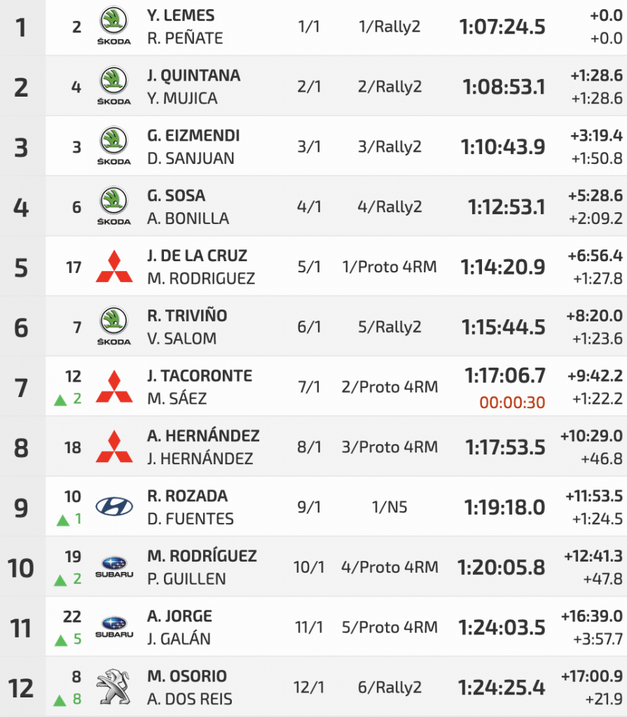 Gran remontada la de los locales Juan Carlos de La Cruz y Miguel Ángel Rodríguez para llevar su Mitsubishi Lancer Evo IX a la quinta plaza, por delante del mexicano Ricardo Triviño y Vicente Salom (Škoda Fabia R5), sextos.