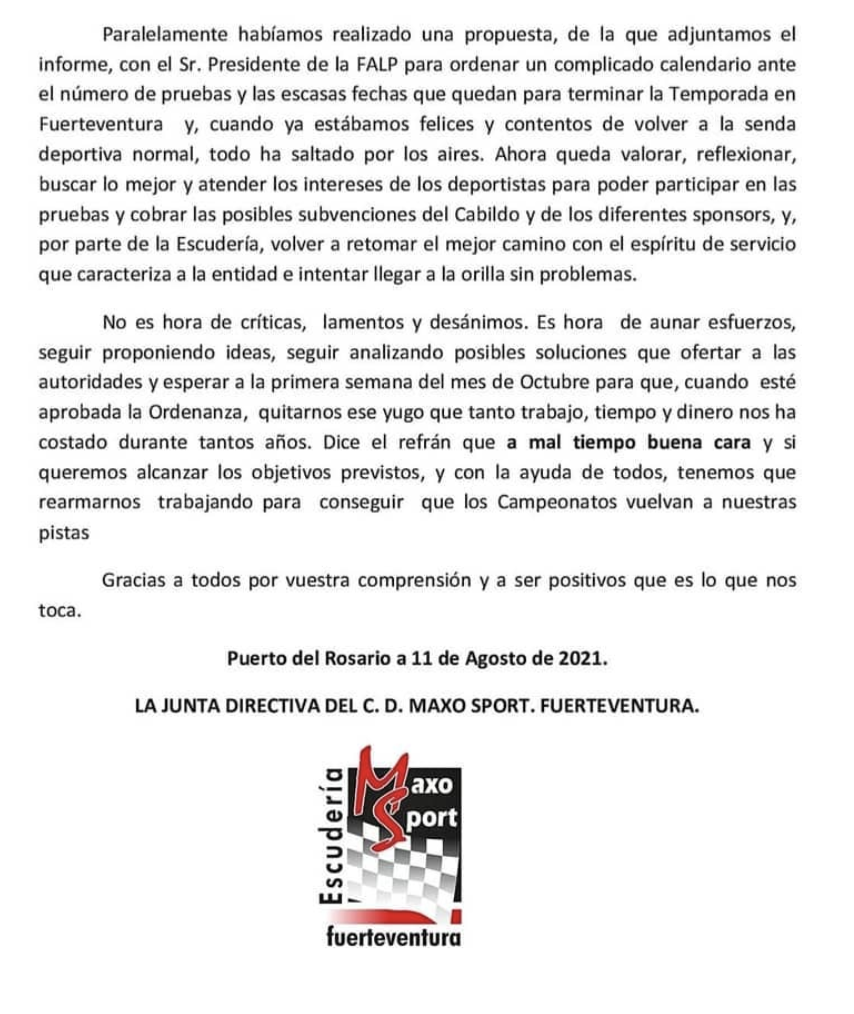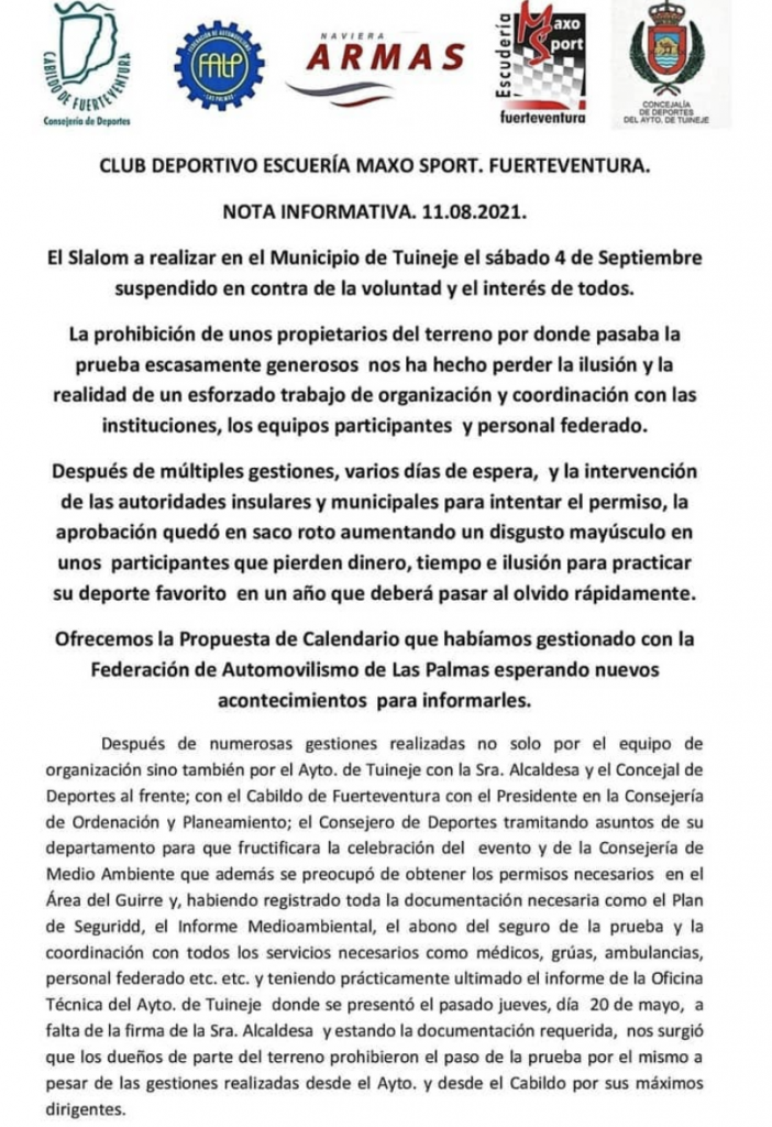 El Club Deportivo Maxo Sport ha informado sobre la suspensión del IX Slalom Naviera Armas y de la propuesta de modificación del calendario de pruebas a disputarse en la isla de Fuerteventura en esta temporada 2021.