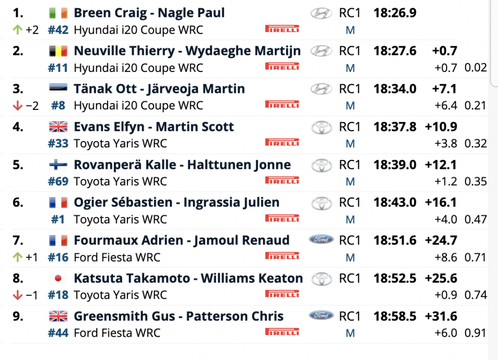 Cuartos se sitúan los británicos Elfyn Evans y Scott Martin (Toyota Yaris WRC), a 10.9 de la cabeza, a 3.8 del tercer lugar y superando en sólo 1.2 a los fineses Kalle Rovanperä y Jonne Halttunen (Toyota Yaris WRC), cuartos, que superan a los líderes Sébastien Ogier y Julien Ingrassia (Toyota Yaris WRC) en 4.0, siendo sextos.