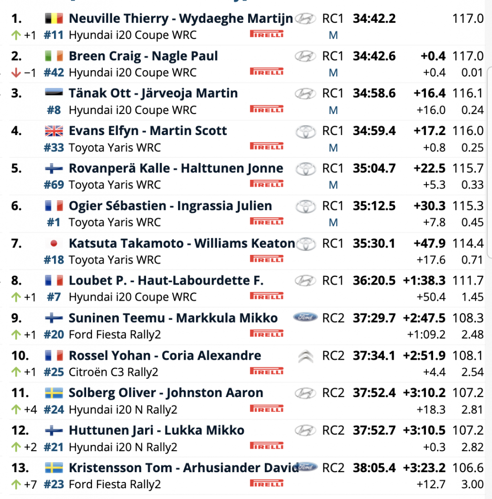 Los británicos Elfyn Evans y Scott Martin (Toyota Yaris WRC) son cuartos, pero ahora a sólo 0.8 de Tänak y Järveoja, mientras que los fineses Kalle Rovanperä y Jonne Halttunen (Toyota Yaris WRC) son cuartos a 5.3 de sus compañeros y los líderes del WRC, los galos Sébastien Ogier y Julien Ingrassia (Toyota Yaris WRC), son sextos a 7.8 de los anteriores.