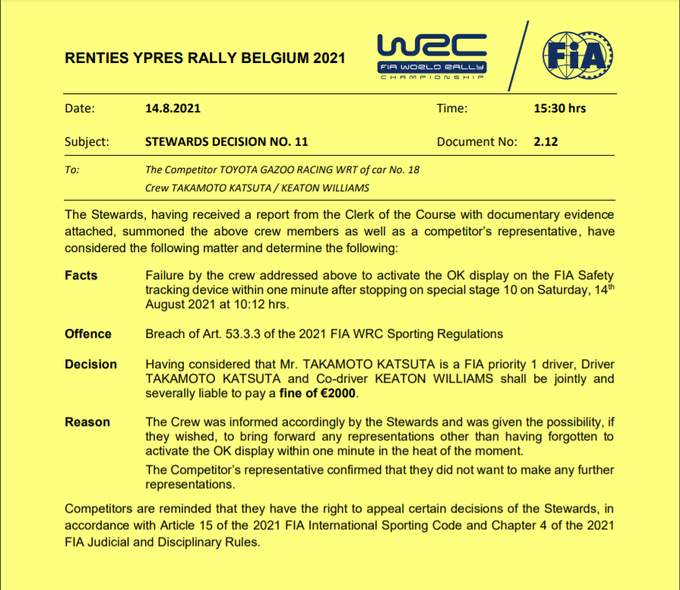 Por otra parte, Takamoto Katsuta y Keaton Williams han recibido una multa de 2000 euros por no activar el botón OK después del accidente que sufrieron en la décima etapa del Rallye de Ypres en Bélgica.