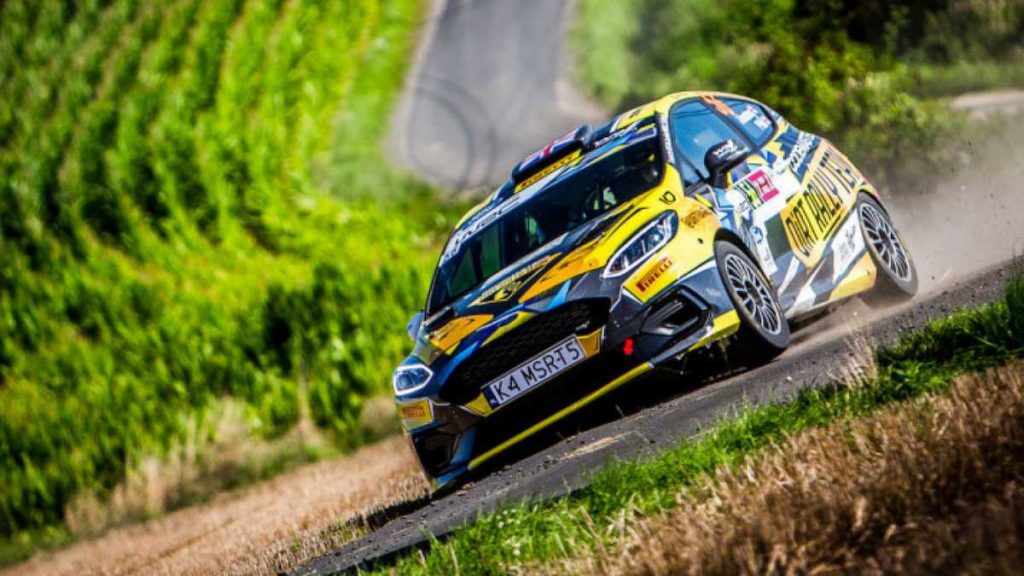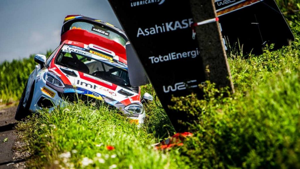 La estrella letona Martins Sesks se retiró tras varar su Ford Fiesta Rally4 de M-Sport Polonia en una zanja por segunda vez este fin de semana. Era quinto antes del percance.