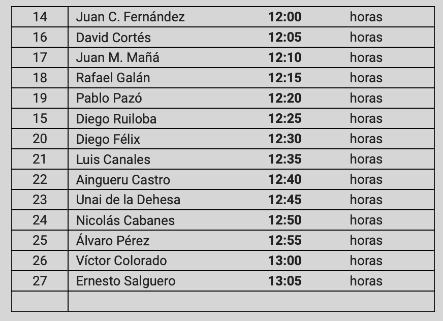 Se ha fijado un horario para cada participante, que habrá que cumplir OBLIGATORIAMENTE y que podéis ver a continuación: