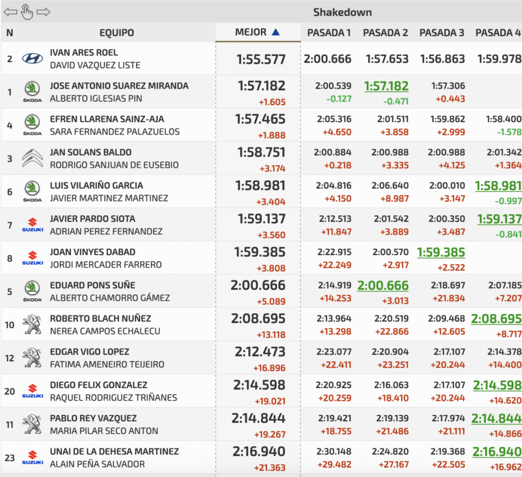 Lógicamente en los pocos más de tres kilómetros del Tramo de Pruebas el de Hyundai no pudo hacer milagros y las diferencias fueron mínimas. “Cohete” Suárez, que sólo realizó tres pasadas, quedó a cuatro décimas al volante del Skoda Fabia R5 Evo lo que le sirvió para ser segundo mientras que Efrén Llarena, presente en Ferrol a modo de test, ocupó el tercer cajón del podio.