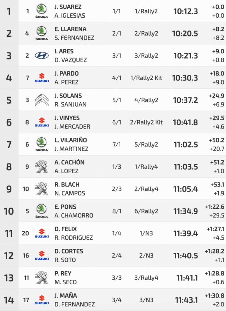 Terceros han sido Iván Ares y David Vázquez (Hyundai i20 Rally2), que tenían problemas de potencia y marcaban un crono de 10:21.3, a 9.0 de Suárez. Ares reconocía que las cosas le salieron “muy mal porque me quedo sin potencia subiendo; incluso cuando salgo de primera no sale. No sé qué problema puede haber”, lamentó.
