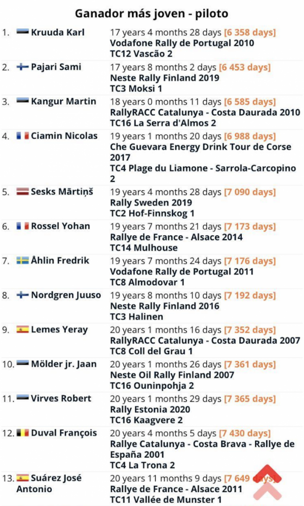 -Noveno piloto en ganar más tramos del Mundial Junior en el WRC, por delante de pilotos como Ogier, Sordo y Neuville, entre otros.