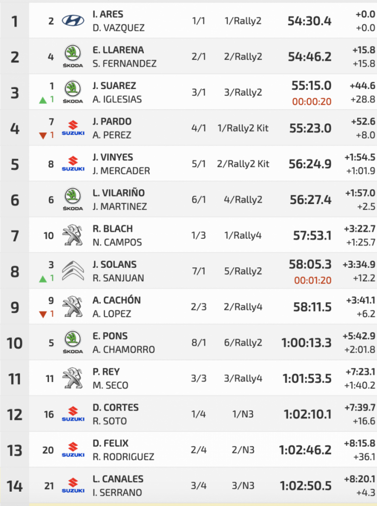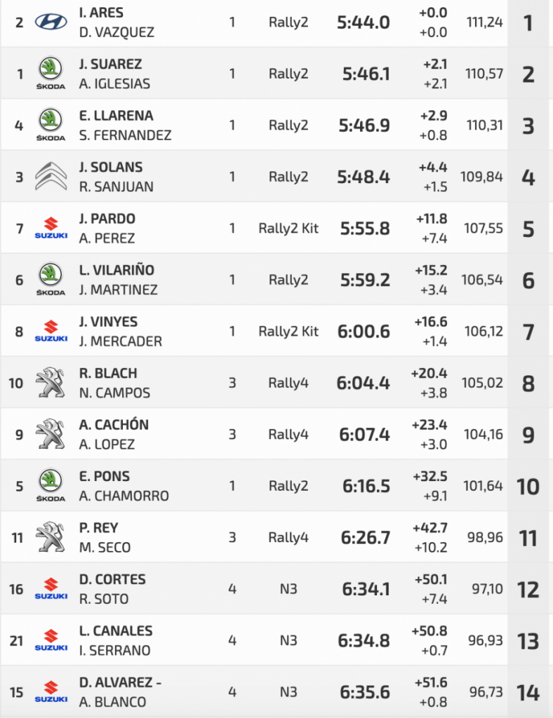 Javier Pardo y Adrián Pérez (Suzuki Swift R4lly S) han caído a la cuarta posición ante el mayor empuje de Suárez e Iglesias, pero no debería tener problemas para conservar esa plaza, salvo problemas mecánicos, puesto que en el quinto lugar están sus compañeros de equipo en Suzuki Joan Vinyes y Jordi Mercader Pérez (Suzuki Swift R4lly S), pero a 1:01.9. Estos últimos sí que tendrá que correr para poder asegurar esa plaza puesto que Luis Vilariño y Javier Martínez (Skoda Fabia Rally2 Evo), sextos, están a sólo 2.5.