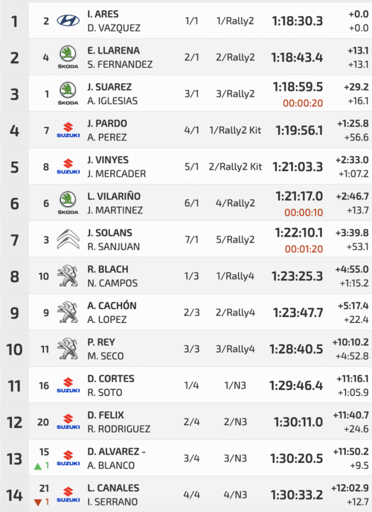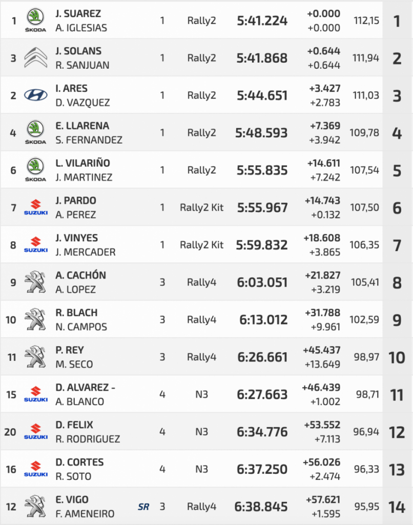 Séptimos, en otro rally muy por debajo de las previsiones, Jan Solans y Rodrigo Sanjuan (Citroën C3 Rally2), que entre un pinchazo y una penalización se fueron lejos de la lucha por los puestos de podio, siendo su ‘lucha’ en la jornada final con Roberto Blach y Nerea Campos (Peugeot 208 Rally 4) por intentar ser séptimos, algo que consiguieron, siendo Blach y Campos octavos y primeros entre los Rally4.