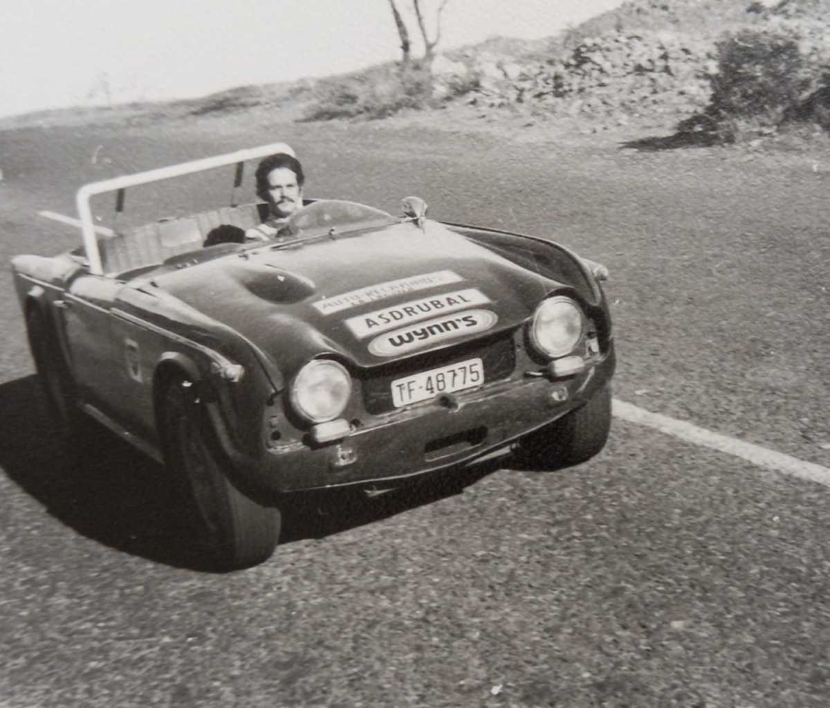 En la fotografía, Asdrúbal acaba de cumplimentar la sesión de los entrenamientos oficiales (7’32»0) en la IV Subida de Vilaflor (Tenerife, 1972). Es 7° absoluto sobre el desvencijado Triumph TR-5 que prepara personalmente desde hace meses en su taller de San Benito (La Laguna).