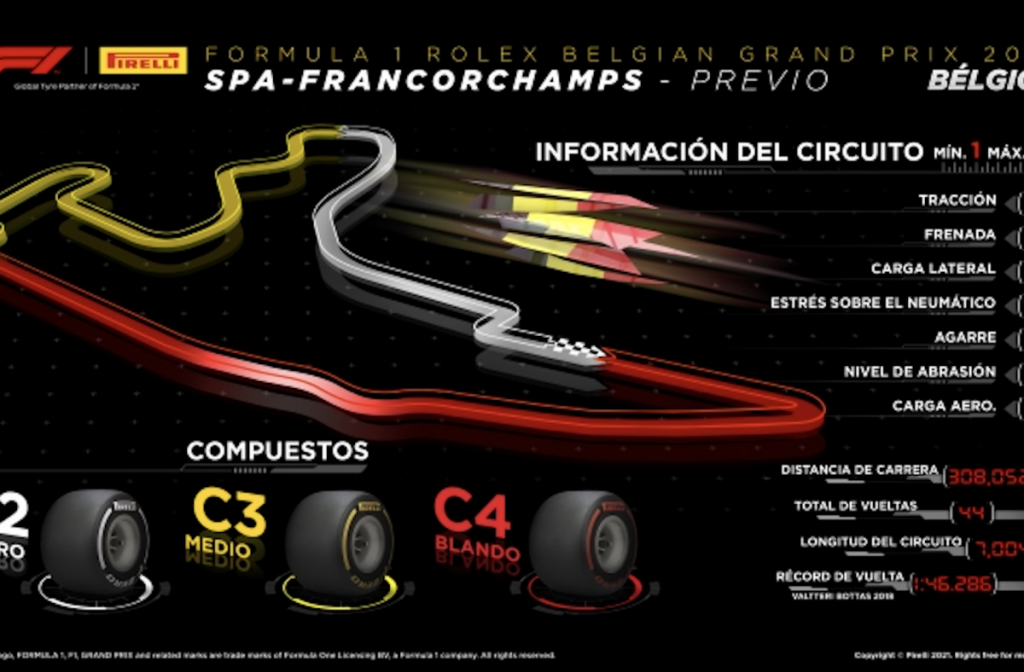 - Punto final al parón veraniego para la Fórmula 1 con motivo del Gran Premio de Bégica, que inicia la primera de tres semanas consecutivas de competición. Pirelli ha desplazado a Spa-Francorchamps los compuestos de la zona media de la gama: C2 como P Zero Blanco (duro), C3 como P Zero Amarillo (medio) y C4 como P Zero Rojo (blando).