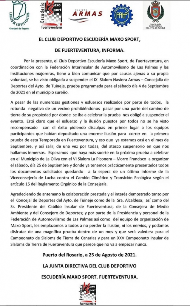 El Club Deportivo Maxo Sport informa sobre la suspensión IX Slalom Naviera Armas- Concejalía de deportes Ayto. de Tuineje (Fuerteventura).