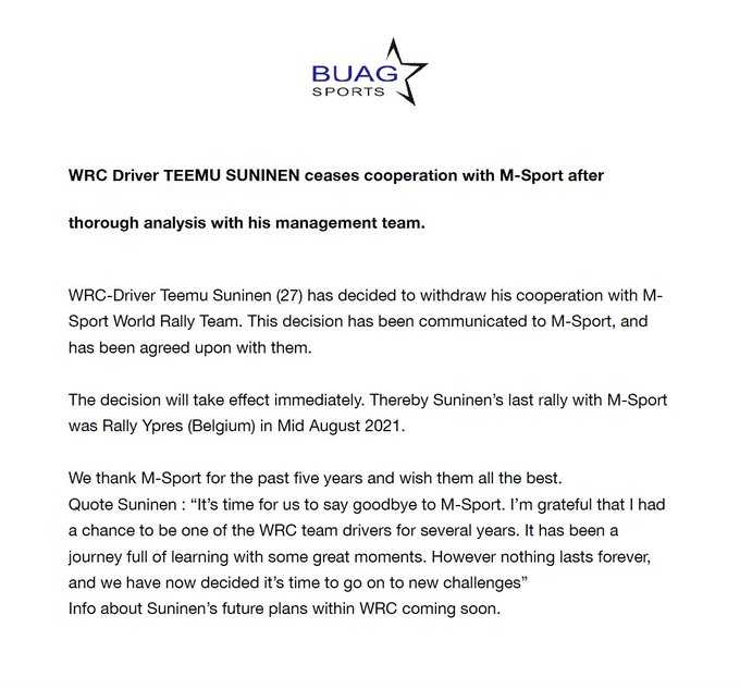Suninen comentó: «Ha llegado el momento de decir adiós a M-Sport. Estoy agradecido por haber tenido la oportunidad de ser uno de los pilotos del equipo del WRC durante varios años. Ha sido un viaje lleno de aprendizaje con algunos grandes momentos. Sin embargo, nada dura para siempre, y ahora hemos decidido que es hora de seguir adelante con nuevos retos.»