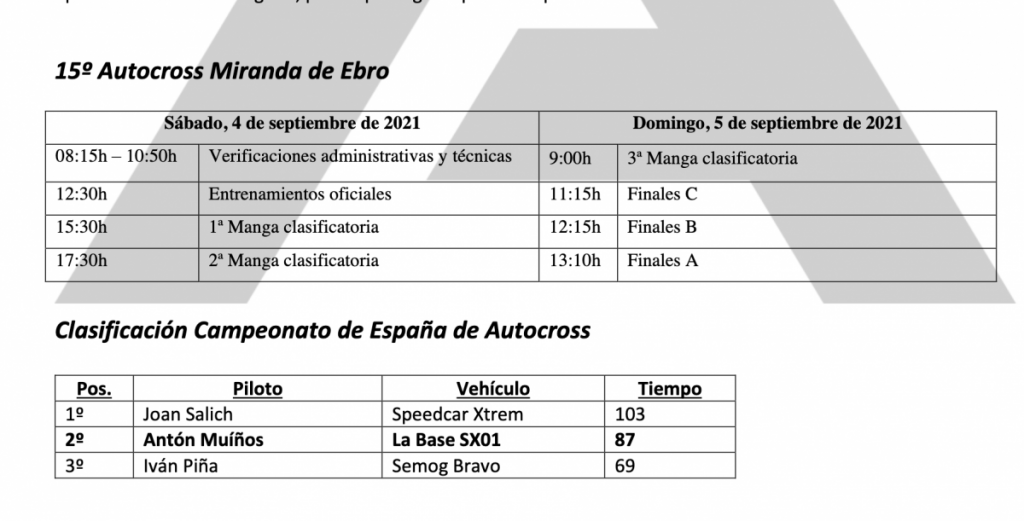 Tras el periplo gallego, en el que Antón Muíños sumó una victoria y una segunda posición, el certamen nacional de autocross viajará este fin de semana hasta la localidad burgalesa de Miranda de Ebro, donde se celebrará la sexta cita del calendario, que significará la penúltima oportunidad del piloto de La Base SX01 para seguir recortando la diferencia de puntos con el líder, siendo Antón Muíños el piloto que más puntos ha sumado en las últimas cuatro pruebas celebradas en el Campeonato de España de Autocross en la que está siendo su primera temporada a bordo