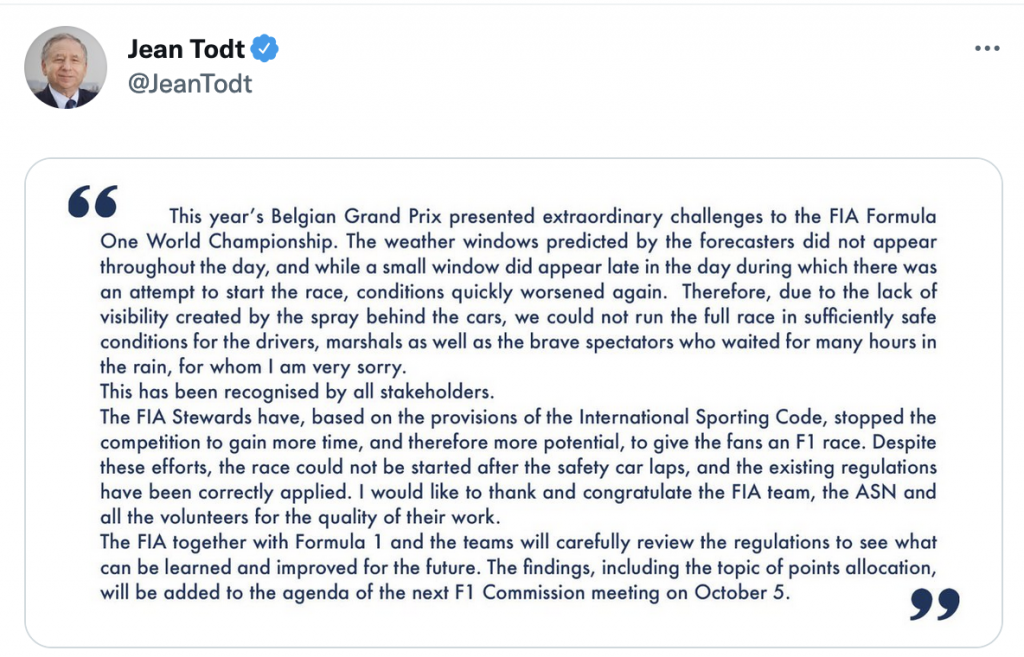«Este año el Gran Premio de Bélgica presentó unos retos extraordinarios al Mundial de F1. La ventana predicha por los meteorólogos no apareció durante el día; y hubo una ventana en la que podíamos intentar empezar la carrera, pero las condiciones meteorológicas se deterioraron rápidamente», explicó Todt en su escrito, hecho público en las redes sociales.