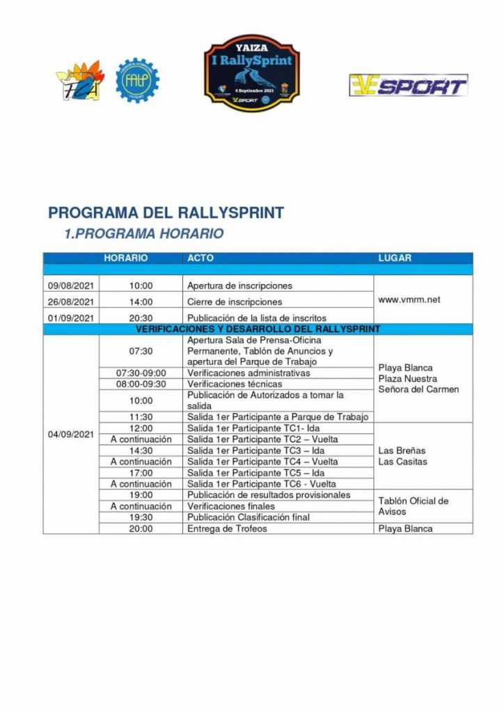 La base de la prueba y actividades como las verificaciones, asistencias, parque cerrado de vehículos y entrega de trofeos estarán en la zona turística de Playa Blanca, concretamente en la Plaza del Carmen. La organización tiene previsto arrancar con la primera pasada al I Rallysprint de Yaiza, a las 12 del mediodía de este sábado, concluyendo con la ceremonia de llegada final, sobre las 19 horas. Las carreteras serán abiertas al tráfico durante 30 minutos en dos ocasiones del transcurso de la prueba, para que los vecinos de la zona puedan salir o regresar a sus domicilios.