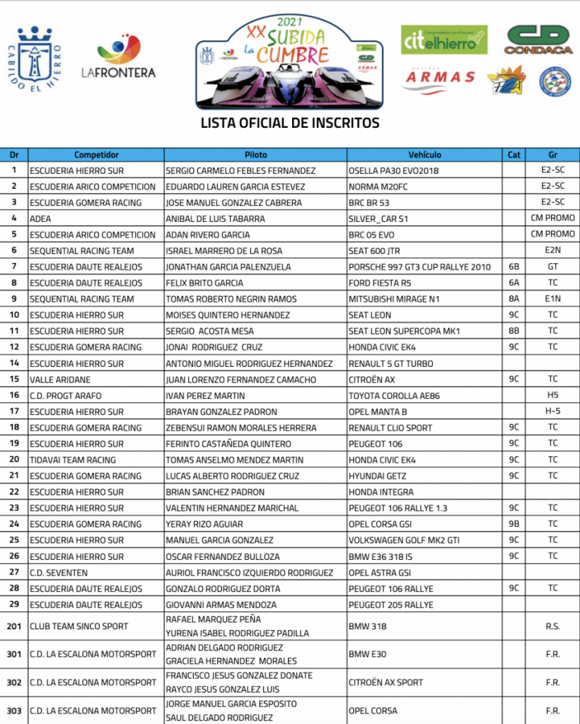 Sergio Febles (Osella Pa30 Evo2018) saldrá con el número 1 en la XX Subida a La Cumbre, pero el gran favorito al triunfo es Lauren García, que saldrá con el número 2 en su Norma M20FC.