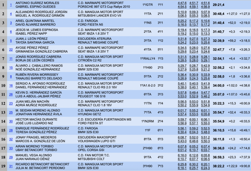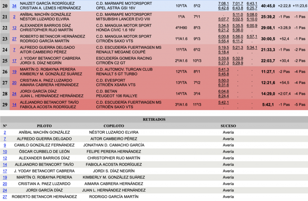 Gran carrera, otra más, para los rápidos y fiables Jesús M. Lemes e Isabel Pérez (Seat Ibiza 1.8 20V Turbo), que quedaron a sólo 0.3 del último escalón del podio, que habría sido algo soberbio, pero, a pesar de no haberlo logrardo, es como una victoria poder estar peleándose a la décima con montura mucho más potentes y de última generación. uinto puesto para los grancanarios Juan José León y Taydía Santana (Renault Megane Coupé).