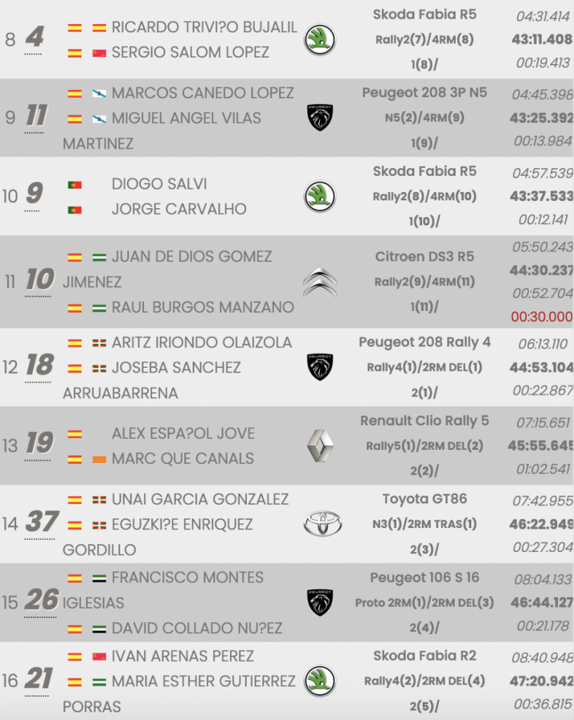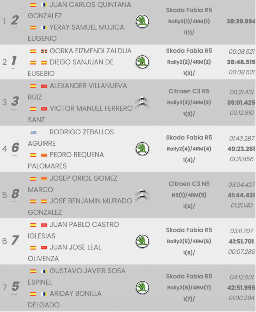 Quintana y Mujica se adjudicaron las tres primeras especiales, logrando una renta de 12.8, pero después los vasco fueron los más rápidos en las dos siguientes, rebajándola hasta los 3.1, pero Juan Carlos y Yeray volvieron a darlo todo para ser los mejores en la sexta cronometrada y ampliar su renta hasta los 8.5 actuales a falta de los más de 22 kilómetros que quedan por disputarse en las dos especiales finales, donde cada equipo logró un triunfo en la primera de las pasadas, por lo que todo está por decidir.