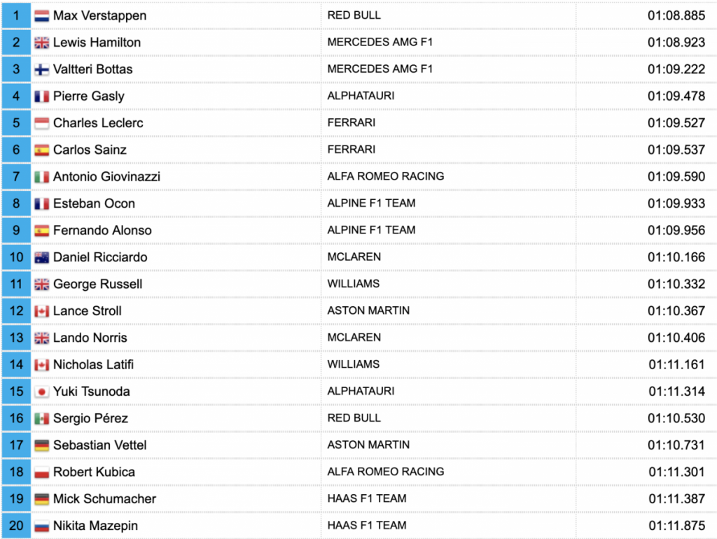 El otro Mercedes, el del finés Valtteri Bottas arrancará tercero, al lado del francés Pierre Gasly (Alpha Tauri), desde la segunda fila.