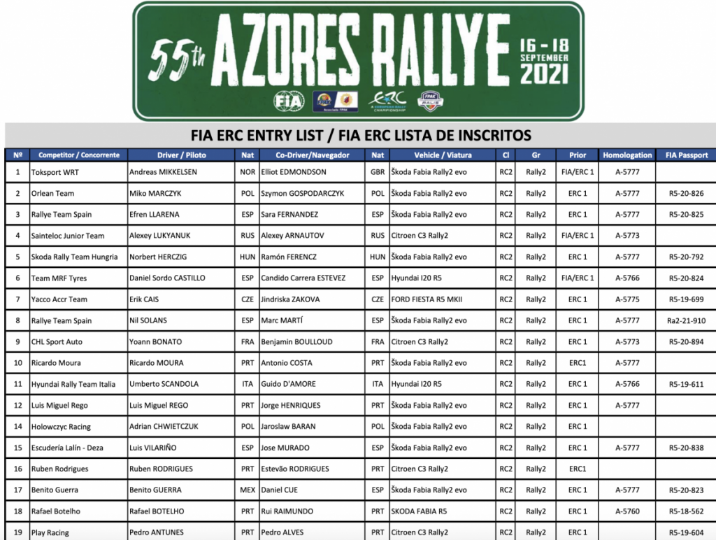 Una alineación repleta de campeones y ganadores participará en el 55 ° Rally de Azores del 16 al 18 de septiembre, la quinta ronda del Campeonato de Europa de Rallyes de la FIA 2021.