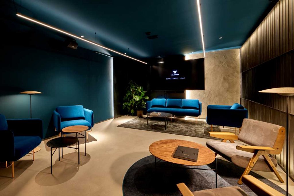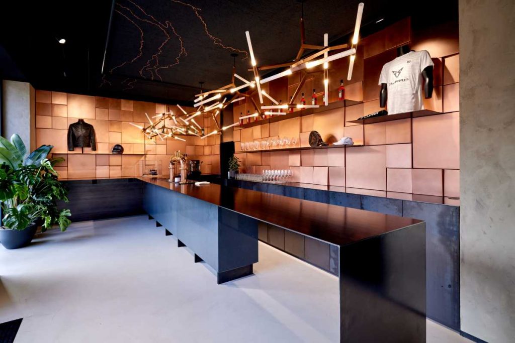 Cada City Garage tiene su propio diseño distintivo respetando la historia del espacio e inspirado en la ciudad donde se ubica, incorporando elementos de diseño local y obras de diseñadores locales. El CUPRA Garage Milano cuenta con sofisticados elementos de diseño como una pared de bloques de cobre. También presenta una obra de arte única en el techo, que representa el vínculo con la electrificación de la industria automotriz. También cuenta con una lámpara Chispa by Marset for CUPRA en la planta baja, así como distintivas decoraciones de pared y muebles de diseño en el sótano. Todos estos elementos representan la interpretación contemporánea de CUPRA de la sofisticación y la singularidad del espacio.