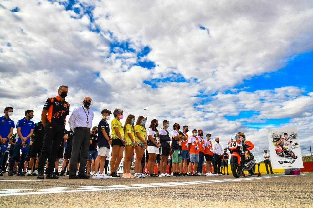 MotoGP y Motorland rinde un emotivo homenaje a Hugo Millán en la recta principal del circuito. Al que han asistido la familia del joven, miembros del paddock, de Dorna, trabajadores y representantes de Motorland y los pilotos del Campeonato del Mundo FIM MotoGPTM.