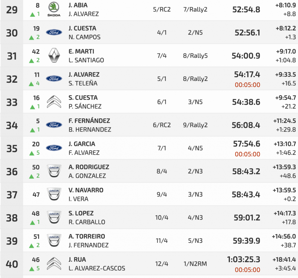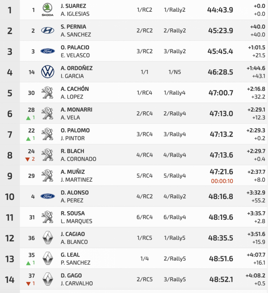 Los líderes del SuperCampeonato de España de Rallys no han tenido problemas ni rivales que les hagan incomodarles en su liderato, aventajando al final de casi 77 kilómetros contra el crono en 40.0 a Surhayen Pernía y Alba Sánchez (Hyundai i20 R5O, siendo terceros, a 1:01.5, los también locales Óscar Palacio y Enrique Velasco (Ford Fiesta R5 MKII), alternándose estos dos equipos las segundas posiciones en los tramos ante el insultante dominio de los líderes.