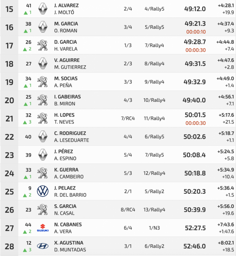 Los líderes del SuperCampeonato de España de Rallys no han tenido problemas ni rivales que les hagan incomodarles en su liderato, aventajando al final de casi 77 kilómetros contra el crono en 40.0 a Surhayen Pernía y Alba Sánchez (Hyundai i20 R5O, siendo terceros, a 1:01.5, los también locales Óscar Palacio y Enrique Velasco (Ford Fiesta R5 MKII), alternándose estos dos equipos las segundas posiciones en los tramos ante el insultante dominio de los líderes.