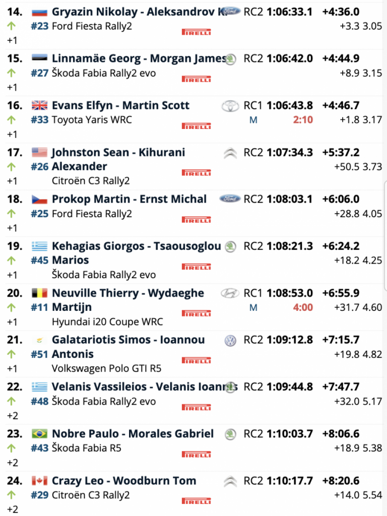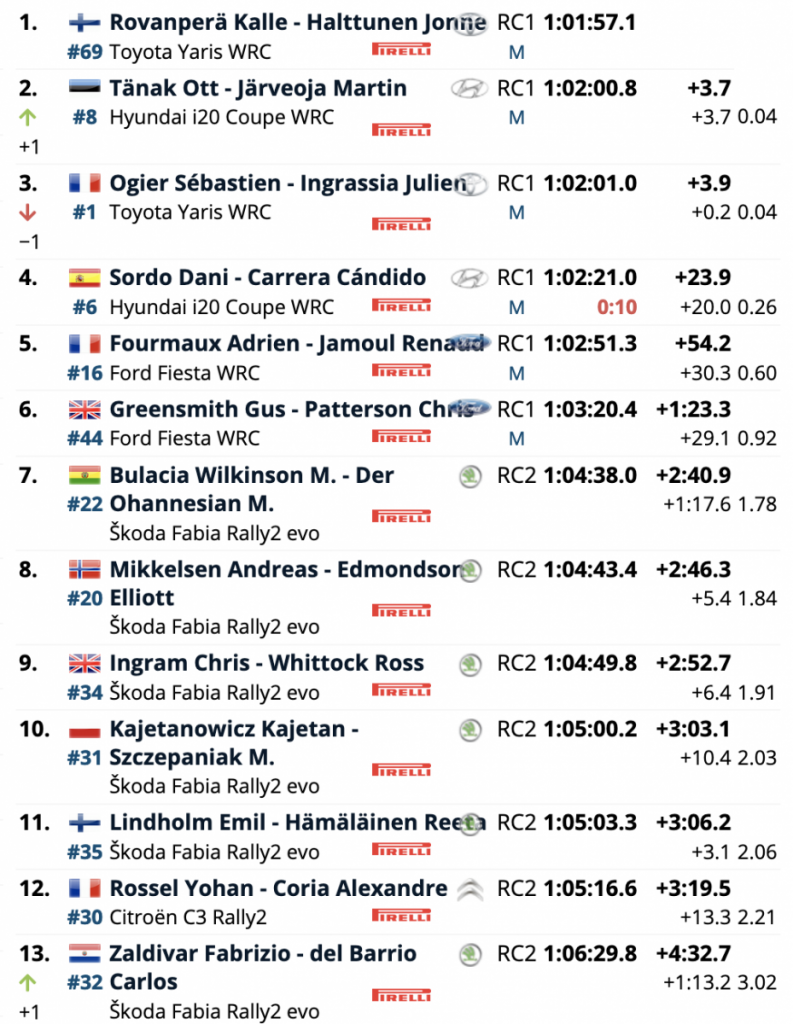 Los del equipo de Toyota ocuparon el primer puesto tras la segunda especial del día, no soltándolo, pero con unas muy escasas diferencias respecto a sus más inmediatos perseguidores, con 3.7 respecto a los estonios Ott Tänak y Martin Järveoja (Hyundai i20 Coupe WRC), segundos, que superan en sólo 0.2 a los galos Sébastien Ogier y Julien Ingrassia (Toyota Yaris WRC), que empezaron primeros pero se han visto penalizados por salir abriendo pista.