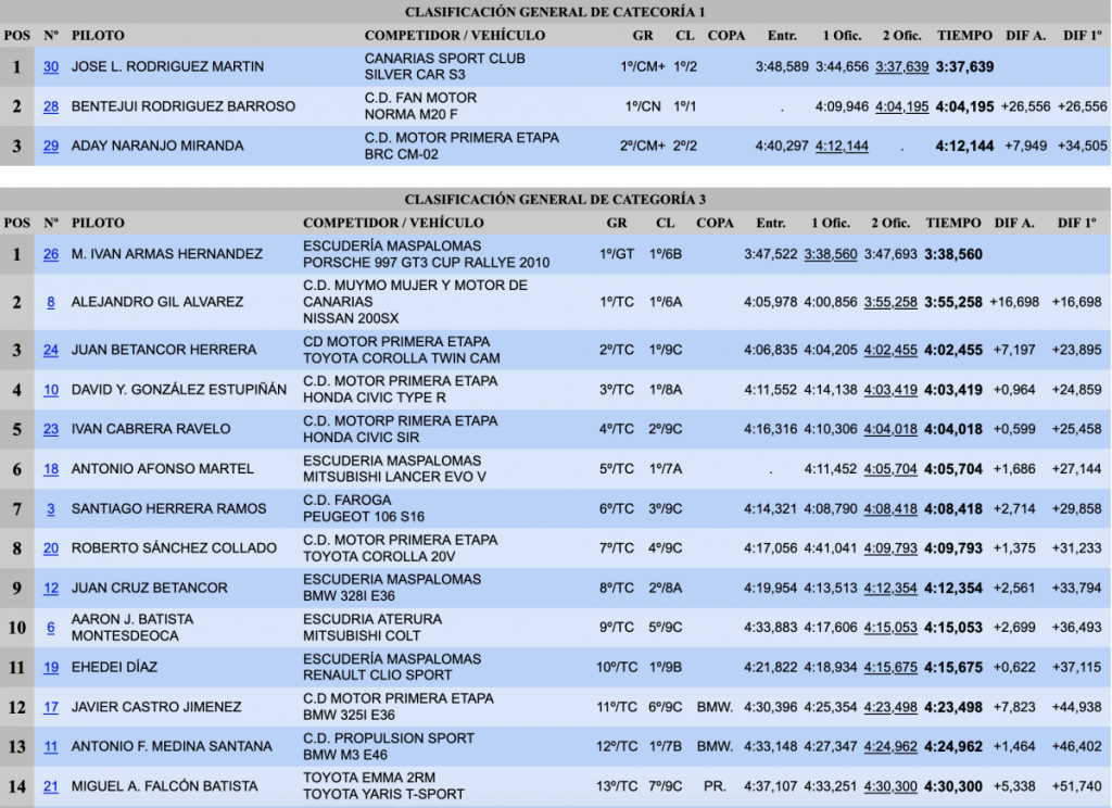 La ausencia de rivales que contaran con monturas más potentes propició que Alejandro Gil llevara su Nissan 200SX, un coche más para drift, a la segunda posición a 16.698 de la cabeza, seguido de Juan Betancor (Toyota Corolla Twin Cam), que se quedaba a 23,895 del primer registro, a 7,197 del segundo, pero en una muy estrecha lucha con David González, que era cuarto con su Honda Civic Type R, pero a sólo 0.964 del último escalón del podio. Pero David tampoco tuvo fácil la cuarta plaza, puesto que logró superar en sólo 0.599 a Iván Cabrera (Honda Civic SIR).