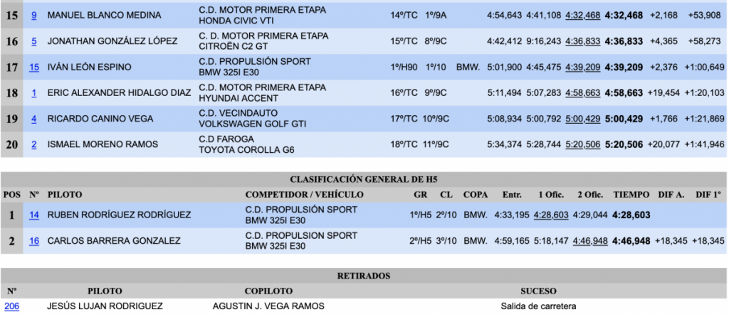 Octavo era Roberto Sánchez (Toyota Corolla 20V), noveno Juan Cruz (BMW 328I E36) y cerraba las diez primeras plazas Aaron J. Batista (Mitsubishi Colt).
