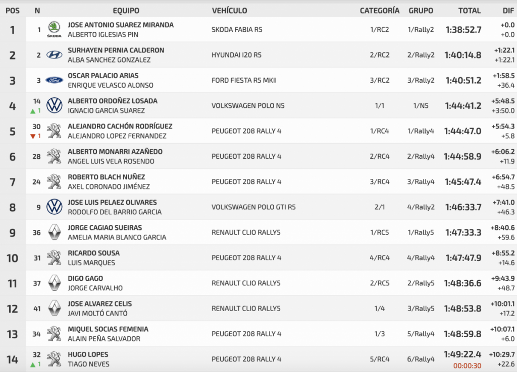 Sextos y segundos Rally4 acabaron Alberto Monarri y Ángel Luis Vela (Peugeot 208 Rally 4), seguidos de Roberto Blach y Axel Coronado (Peugeot 208 Rally 4), terceros Rally4.