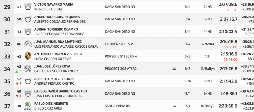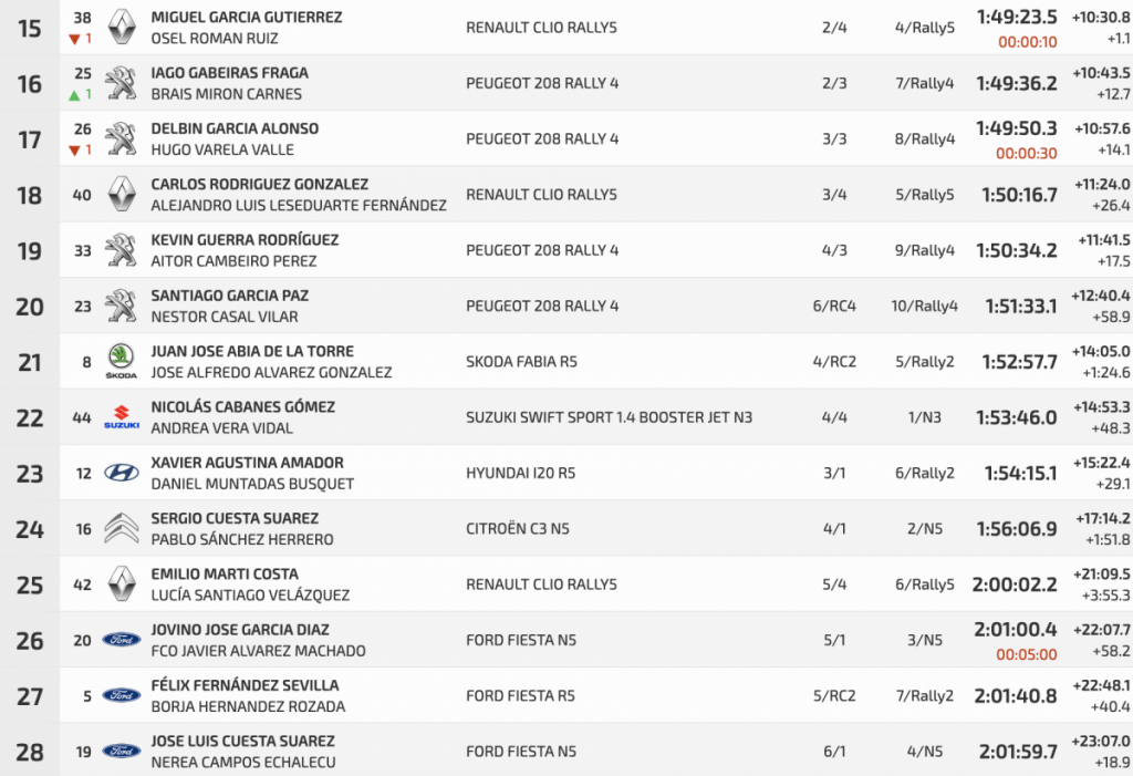 Gran final de rally para Alberto Ordoñez e Ignacio García (Volkswagen Polo N5), que rodaban cuartos, perdía tiempo en un tramo, bajando hasta el noveno puesto, pero pusieron toda la carne en el asador para volver a la cuarta plaza tras un tramo final donde lograron superar en 21.5 a Alejandro Cachón y Alejandro López (Peugeot 208 Rally 4), que se tenían que ‘conformar’ con la quinta plaza y como los más rápidos entre los Rally4.