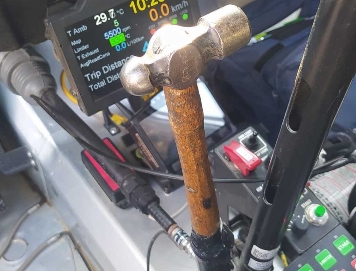 La imagen del día nos la deja la ingeniosa idea de Diego para sustituir la palanca de cambios que se rompía en el primer tramo, utilizando lo que tenia a mano se inventaba una palanca de cambios nueva y plenamente funcional