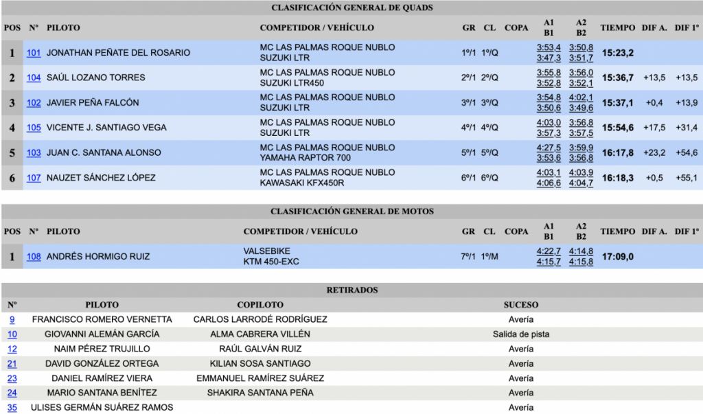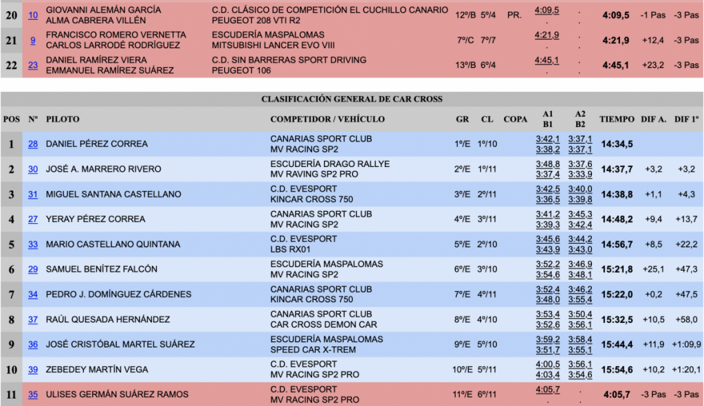 Después de la disputa de las cuatro mangas de las que consistía la cita celebrada en el sur de la isla, en las que se impusieron en todas ellas, lograron un tiempo final de 14:30,0, lo que supuso superar en 43.0 a Pedro Cuarental y Yeray Mujica (Mitsubishi Lancer Evo IX), que nada pudieron hacer ante la patente superioridad de los ganadores.