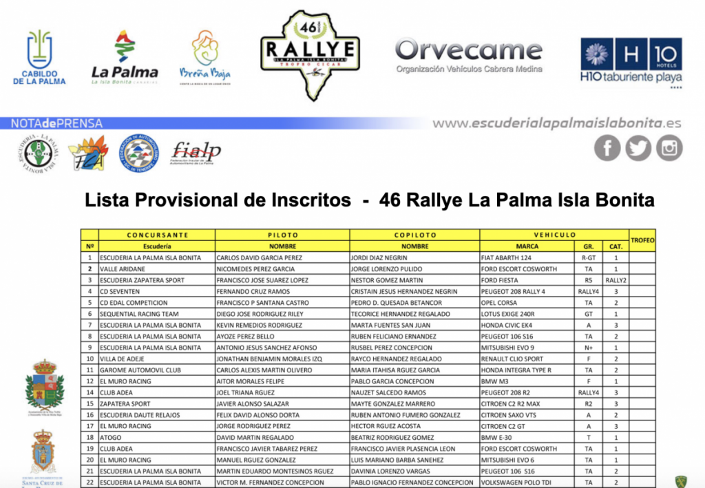 Lista Provisional de Inscritos 46 Rallye La Palma Isla Bonita