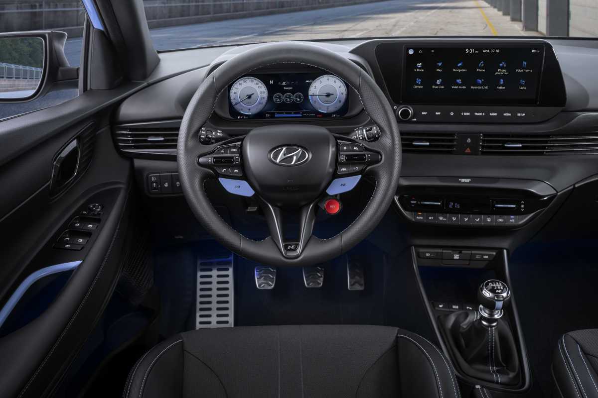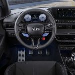 En el interior, el Nuevo i20 N presenta un espacio de conducción de alto rendimiento con una serie de características exclusivas de la marca N. Esto incluye asientos deportivos específicos con reposacabezas integrados. El logotipo N ocupa un lugar destacado y está presente en el volante y en el pomo de la palanca de cambios. El interior es de color negro con detalles en Performance Blue y con un techo completamente negro.