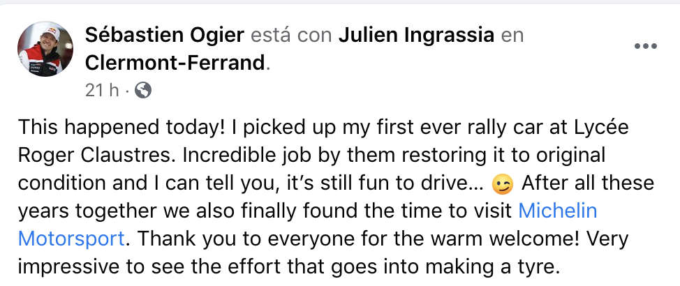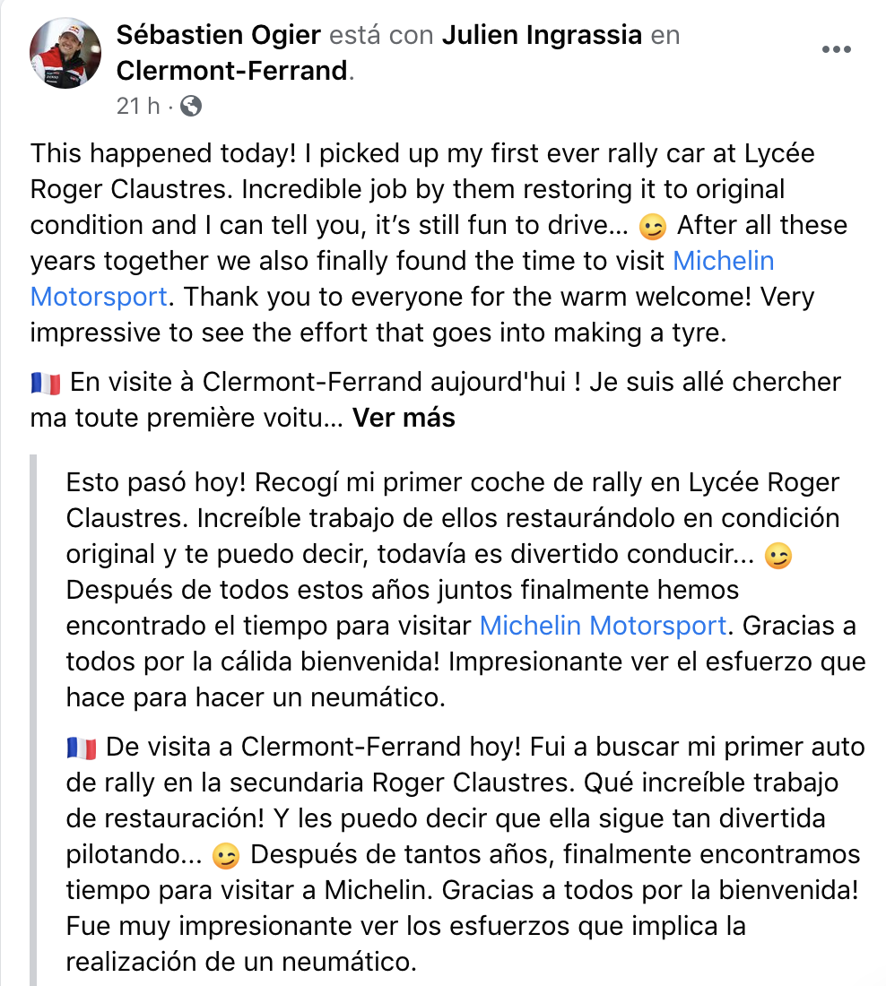 Los siete veces campeones del mundo de rallys empezaron su día yendo al instituto Roger Claustres, un colegio donde Sébastien Ogier completó sus estudios de mecánica antes de competir en los rallys. El piloto de Gapençais pudo ver el Peugeot con el que debutó en los rallys en 2006, unidad que, tras un enorme trabajo de restauración llevado a cabo por los estudiantes de secundaria durante los tres últimos años, pasará a su colección particular, mientras que Julien Ingrassia heredó la versión victoriosa de 2007.
