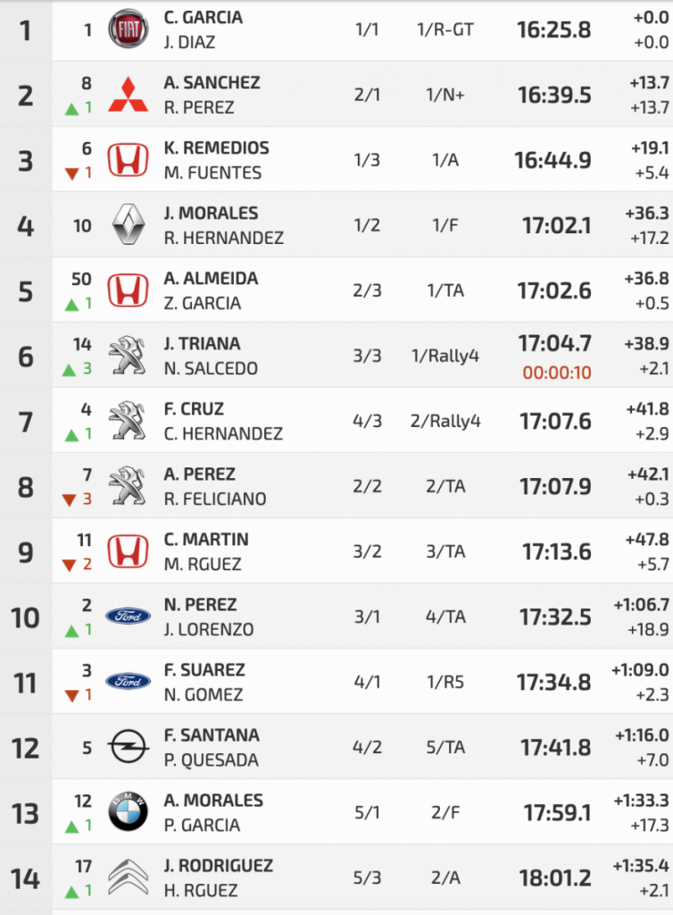 Joel Triana y Nauzet Salcedo, con el Peugeot 208 R2, y a pesar de una penalización de diez segundos, están en la sexta plaza a 2.6 del cuarto y a 2.1 del quinto puesto, aunque también tiene muy cerca al tinerfeño Fernando Cruz y el gomero Cristian Hernández (Peugeot 208 Rally4), séptimos a 2.9 del sexto lugar.