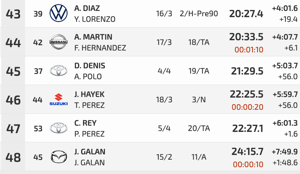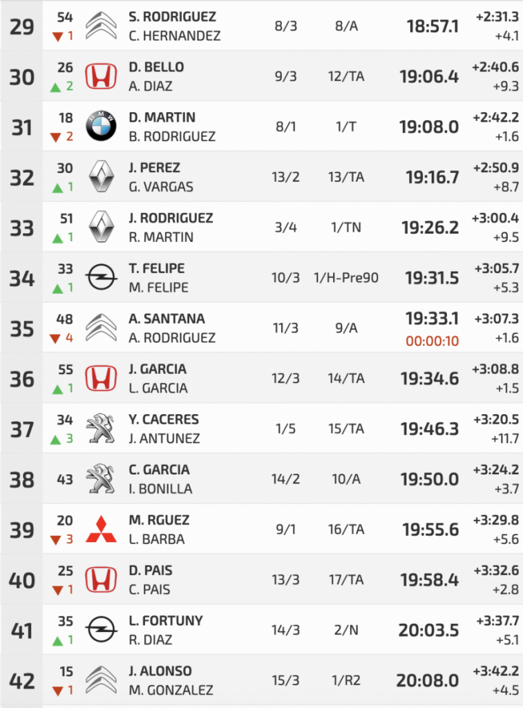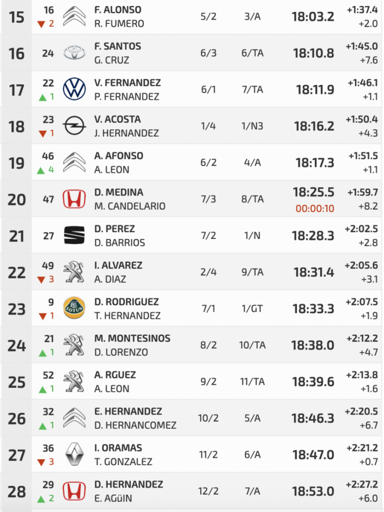 Octavos son Ayoze Pérez-Rubén Feliciano (Peugeot 106 S16), que están a sólo 0.3 del séptimo lugar y 5.5 con la sexta plaza, por lo que todo puede pasar. Novenos son Carlos Alexis Martín-Itahisa Rodríguez (Honda Integra Type R) a 5.7 de Pérez y Feliciano, cerrando las diez primeras uno de los equipos de los que se esperaba que estuvieran luchando por el podio, como es el caso de Nicomedes Pérez-Jorge Lorenzo (Ford Escort RS Cosworth)